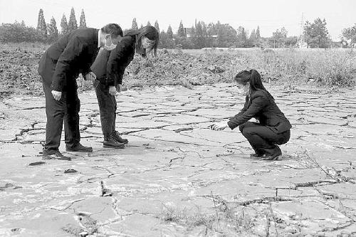 4月24日,仙桃市检察院检察官在受污染的农用地上调查取证