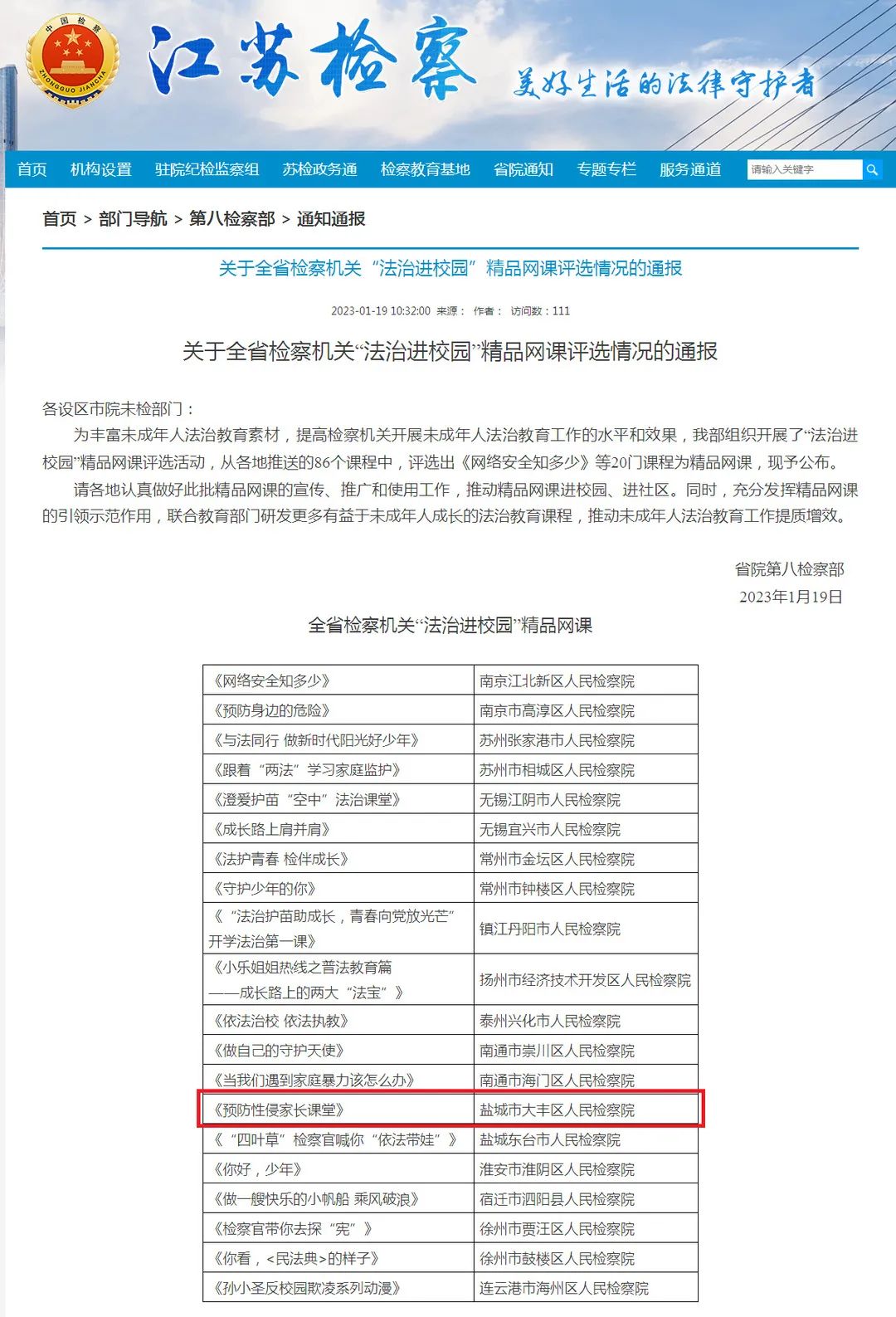 近日,江苏省人民检察院通报全省检察机关“法治进校园”精品网课评选结果,我院报送的《预防性侵害家长课堂》获评精品网课。